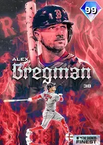 This is the 2025 Finest card for Alex Bregman, featured in MLB The Show 25. He's a 99 Overall Diamond card primarily playing 3B. He can also fill in at 2B, SS. At the plate, Alex Bregman displays elite contact overall, with specific ratings of 115 Contact vs Right and 125 Contact vs Left. He brings elite power to the plate, evident from his 113 Power vs Right and 100 Power vs Left. In terms of plate discipline, his elite Vision stands at 118, paired with his elite Discipline rating of 108. In the field, Alex Bregman is a elite defender. His key defensive attributes are 90 Fielding, 80 Arm Strength, and 87 Reaction time. On the basepaths, Alex Bregman showcases below average speed. This is supported by 49 Speed, a 15 Stealing rating, and 15 Baserunning Aggression. Alex Bregman is a 30-year-old baseball player, stands 5'11" and weighs 190 lbs, born in New Mexico, currently playing for the Red Sox, bats R and throws R. Active Quirks for Alex Bregman: Homebody, Unfazed, Table Setter. Other available versions for Alex Bregman include: 2025 All-Star (96 Diamond), New Threads (88 Diamond), Live (83 Gold).
