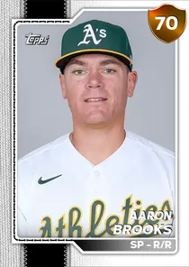 This is the Live card for Aaron Brooks, featured in MLB The Show 26. He's a 70 Overall Bronze card primarily playing SP. Available on the marketplace for around 29 stubs (sell now price). Aaron Brooks has a elite Meta Score of 65.55, indicating his overall effectiveness in competitive play. On the mound, Aaron Brooks exhibits below average H/9 with a 56 rating, below average K/9 with a 50 rating, and average BB/9 with a 67 rating. His overall pitching profile is defined by below average control with a Control rating of 52, great velocity with a Velocity rating of 84, and great break with a Break rating of 86. He utilizes a 5-pitch mix, spearheaded by a Sinker, complemented by a Circle Change. Key pitches include: Sinker, Circle Change, 4-Seam Fastball, Slider, Curveball. Aaron Brooks is a 35-year-old baseball player, stands 6'4" and weighs 230 lbs, born in California, currently playing for the Free Agents, bats R and throws R. Other available versions for Aaron Brooks include: Live (70 Bronze).