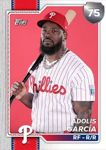 This is the Live card for Adolis García, featured in MLB The Show 26. He's a 75 Overall Silver card primarily playing RF. Available on the marketplace for around 60 stubs (buy now price). Adolis García has a elite Meta Score of 65.03, indicating his overall effectiveness in competitive play. At the plate, Adolis García displays below average contact overall, with specific ratings of 56 Contact vs Right and 52 Contact vs Left. He brings average power to the plate, evident from his 65 Power vs Right and 70 Power vs Left. In terms of plate discipline, his below average Vision stands at 51, paired with his below average Discipline rating of 47. In the field, Adolis García is a average defender. His key defensive attributes are 68 Fielding, 90 Arm Strength, and 64 Reaction time. On the basepaths, Adolis García showcases below average speed and below average stealing ability. This is supported by 50 Speed, a 40 Stealing rating, and 56 Baserunning Aggression. Adolis García is a 33-year-old baseball player, stands 6'0" and weighs 205 lbs, born in Cuba, currently playing for the Phillies, bats R and throws R. Active Quirks for Adolis García: Situational Hitter. Other available versions for Adolis García include: Live (78 Silver).