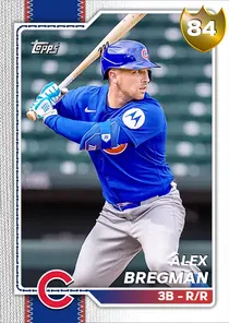 This is the Live card for Alex Bregman, featured in MLB The Show 26. He's a 84 Overall Gold card primarily playing 3B. He can also fill in at 2B, SS. Available on the marketplace for around 1,627 stubs (buy now price). Alex Bregman has a elite Meta Score of 77.34, indicating his overall effectiveness in competitive play. At the plate, Alex Bregman displays great contact overall, with specific ratings of 78 Contact vs Right and 88 Contact vs Left. He brings good power to the plate, evident from his 73 Power vs Right and 68 Power vs Left. In terms of plate discipline, his great Vision stands at 88, paired with his good Discipline rating of 72. In the field, Alex Bregman is a great defender. His key defensive attributes are 80 Fielding, 57 Arm Strength, and 71 Reaction time. On the basepaths, Alex Bregman showcases below average speed and below average stealing ability. This is supported by 40 Speed, a 12 Stealing rating, 0 Baserunning Ability, and 12 Baserunning Aggression. Alex Bregman is a 31-year-old baseball player, stands 5'11" and weighs 190 lbs, born in New Mexico, currently playing for the Cubs, bats R and throws R. Active Quirks for Alex Bregman: Road Warrior, Unfazed, Rally Monkey, Night Player. Other available versions for Alex Bregman include: 2025 Finest (99 Diamond), 2025 All-Star (96 Diamond), New Threads (88 Diamond), World Baseball Classic (88 Diamond), Live (83 Gold).