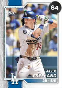 This is the Live card for Alex Freeland, featured in MLB The Show 26. He's a 64 Overall Common card primarily playing 2B. He can also fill in at 3B, SS. Available on the marketplace for around 14 stubs (sell now price). Alex Freeland has a elite Meta Score of 55.95, indicating his overall effectiveness in competitive play. At the plate, Alex Freeland displays below average contact overall, with specific ratings of 47 Contact vs Right and 48 Contact vs Left. He brings below average power to the plate, evident from his 50 Power vs Right and 50 Power vs Left. In terms of plate discipline, his below average Vision stands at 45, paired with his below average Discipline rating of 50. In the field, Alex Freeland is a good defender. His key defensive attributes are 77 Fielding, 64 Arm Strength, and 70 Reaction time. Alex Freeland is a 24-year-old baseball player, stands 6'0" and weighs 200 lbs, born in Kentucky, currently playing for the Dodgers, bats S and throws R. Other available versions for Alex Freeland include: Topps Now (97 Diamond), Live (66 Bronze).