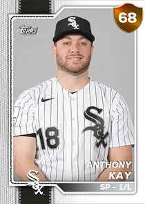 This is the Live card for Anthony Kay, featured in MLB The Show 26. He's a 68 Overall Bronze card primarily playing SP. Available on the marketplace for around 178 stubs (buy now price). Anthony Kay has a elite Meta Score of 64.03, indicating his overall effectiveness in competitive play. On the mound, Anthony Kay exhibits average H/9 with a 64 rating, below average K/9 with a 42 rating, and below average BB/9 with a 53 rating. His overall pitching profile is defined by below average control with a Control rating of 51, elite velocity with a Velocity rating of 92, and average break with a Break rating of 67. He utilizes a 5-pitch mix, spearheaded by a Sinker, complemented by a 4-Seam Fastball. Key pitches include: Sinker, 4-Seam Fastball, Cutter, Sweeper, Circle Change. Anthony Kay is a 31-year-old baseball player, stands 6'0" and weighs 225 lbs, born in New York, currently playing for the White Sox, bats L and throws L.
