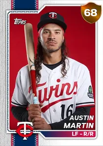 This is the Live card for Austin Martin, featured in MLB The Show 26. He's a 68 Overall Bronze card primarily playing LF. He can also fill in at 2B, CF. Available on the marketplace for around 27 stubs (buy now price). Austin Martin has a elite Meta Score of 59.25, indicating his overall effectiveness in competitive play. At the plate, Austin Martin displays good contact overall, with specific ratings of 67 Contact vs Right and 83 Contact vs Left. He brings below average power to the plate, evident from his 34 Power vs Right and 38 Power vs Left. In terms of plate discipline, his good Vision stands at 75, paired with his average Discipline rating of 69. On the basepaths, Austin Martin showcases good speed and below average stealing ability. This is supported by 70 Speed, a 49 Stealing rating, and 76 Baserunning Aggression. Austin Martin is a 26-year-old baseball player, stands 5'11" and weighs 185 lbs, born in Florida, currently playing for the Twins, bats R and throws R. Other available versions for Austin Martin include: Live (67 Bronze).