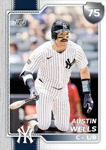 This is the Live card for Austin Wells, featured in MLB The Show 26. He's a 75 Overall Silver card primarily playing C. Available on the marketplace for around 58 stubs (buy now price). Austin Wells has a elite Meta Score of 67.63, indicating his overall effectiveness in competitive play. At the plate, Austin Wells displays below average contact overall, with specific ratings of 55 Contact vs Right and 58 Contact vs Left. He brings average power to the plate, evident from his 76 Power vs Right and 61 Power vs Left. In terms of plate discipline, his below average Vision stands at 59, paired with his average Discipline rating of 65. In the field, Austin Wells is a elite defender. His key defensive attributes are 90 Fielding, 62 Arm Strength, and 0 Reaction time. On the basepaths, Austin Wells showcases below average speed and below average stealing ability. This is supported by 40 Speed, a 13 Stealing rating, 0 Baserunning Ability, and 18 Baserunning Aggression. Austin Wells is a 26-year-old baseball player, stands 6'1" and weighs 220 lbs, born in Nevada, currently playing for the Yankees, bats L and throws R. Active Quirks for Austin Wells: First-Pitch Hitter. Other available versions for Austin Wells include: World Baseball Classic (88 Diamond), Topps Now (86 Diamond), Live (79 Silver).