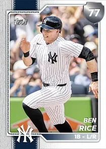 This is the Live card for Ben Rice, featured in MLB The Show 26. He's a 77 Overall Silver card primarily playing 1B. He can also fill in at C. Available on the marketplace for around 109 stubs (buy now price). Ben Rice has a elite Meta Score of 67.67, indicating his overall effectiveness in competitive play. At the plate, Ben Rice displays below average contact overall, with specific ratings of 70 Contact vs Right and 40 Contact vs Left. He brings good power to the plate, evident from his 76 Power vs Right and 79 Power vs Left. In terms of plate discipline, his good Vision stands at 70, paired with his good Discipline rating of 71. In the field, Ben Rice is a average defender. His key defensive attributes are 61 Fielding, 50 Arm Strength, and 66 Reaction time. On the basepaths, Ben Rice showcases below average speed and below average stealing ability. This is supported by 57 Speed, a 3 Stealing rating, and 12 Baserunning Aggression. Ben Rice is a 27-year-old baseball player, stands 6'2" and weighs 228 lbs, born in Massachusetts, currently playing for the Yankees, bats L and throws R. Active Quirks for Ben Rice: Homebody, Dead Red, Breaking Ball Hitter, Unfazed, Day Player, Table Setter. Other available versions for Ben Rice include: 2025 Finest (99 Diamond), Topps Now (97 Diamond), Topps Now (84 Gold), Live (83 Gold).