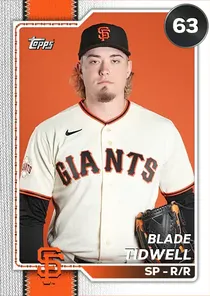 This is the Live card for Blade Tidwell, featured in MLB The Show 26. He's a 63 Overall Common card primarily playing SP. Available on the marketplace for around 44 stubs (sell now price). Blade Tidwell has a elite Meta Score of 57.69, indicating his overall effectiveness in competitive play. On the mound, Blade Tidwell exhibits below average H/9 with a 50 rating, below average K/9 with a 52 rating, and below average BB/9 with a 40 rating. His overall pitching profile is defined by below average control with a Control rating of 56, great velocity with a Velocity rating of 81, and average break with a Break rating of 62. He utilizes a 5-pitch mix, spearheaded by a 4-Seam Fastball, complemented by a Slider. Key pitches include: 4-Seam Fastball, Slider, Curveball, Changeup, Sweeper. Blade Tidwell is a 24-year-old baseball player, stands 6'4" and weighs 207 lbs, born in Tennessee, currently playing for the Giants, bats R and throws R. Other available versions for Blade Tidwell include: Live (57 Common).