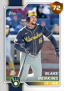 This is the Live card for Blake Perkins, featured in MLB The Show 26. He's a 72 Overall Bronze card primarily playing CF. He can also fill in at LF, RF. Available on the marketplace for around 37 stubs (buy now price). Blake Perkins has a elite Meta Score of 71.67, indicating his overall effectiveness in competitive play. At the plate, Blake Perkins displays below average contact overall, with specific ratings of 46 Contact vs Right and 67 Contact vs Left. He brings below average power to the plate, evident from his 37 Power vs Right and 46 Power vs Left. In terms of plate discipline, his below average Vision stands at 51, paired with his average Discipline rating of 68. In the field, Blake Perkins is a elite defender. His key defensive attributes are 90 Fielding, 82 Arm Strength, and 76 Reaction time. On the basepaths, Blake Perkins showcases great speed and good stealing ability. This is supported by 85 Speed, a 70 Stealing rating, and 79 Baserunning Aggression. Blake Perkins is a 29-year-old baseball player, stands 6'0" and weighs 187 lbs, born in Arizona, currently playing for the Brewers, bats S and throws R. Other available versions for Blake Perkins include: Live (77 Silver).