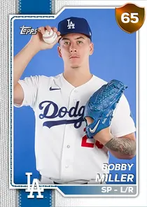 This is the Live card for Bobby Miller, featured in MLB The Show 26. He's a 65 Overall Bronze card primarily playing SP. Available on the marketplace for around 35 stubs (sell now price). Bobby Miller has a elite Meta Score of 59.43, indicating his overall effectiveness in competitive play. On the mound, Bobby Miller exhibits below average H/9 with a 57 rating, below average K/9 with a 57 rating, and below average BB/9 with a 43 rating. His overall pitching profile is defined by below average control with a Control rating of 51, elite velocity with a Velocity rating of 99, and great break with a Break rating of 89. He utilizes a 5-pitch mix, spearheaded by a 4-Seam Fastball, complemented by a Circle Change. Key pitches include: 4-Seam Fastball, Circle Change, Curveball, 2-Seam Fastball, Slider. Bobby Miller is a 26-year-old baseball player, stands 6'5" and weighs 220 lbs, born in Illinois, currently playing for the Dodgers, bats L and throws R. Other available versions for Bobby Miller include: Live (71 Bronze).