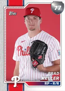 This is the Live card for Brad Keller, featured in MLB The Show 26. He's a 77 Overall Silver card primarily playing RP. Available on the marketplace for around 110 stubs (buy now price). Brad Keller has a elite Meta Score of 76.47, indicating his overall effectiveness in competitive play. On the mound, Brad Keller exhibits great H/9 with a 82 rating, average K/9 with a 68 rating, and average BB/9 with a 66 rating. His overall pitching profile is defined by below average control with a Control rating of 56, elite velocity with a Velocity rating of 99, and elite break with a Break rating of 98. He utilizes a 5-pitch mix, spearheaded by a 4-Seam Fastball, complemented by a Slider. Key pitches include: 4-Seam Fastball, Slider, Sweeper, Sinker, Circle Change. Brad Keller is a 30-year-old baseball player, stands 6'5" and weighs 255 lbs, born in Georgia, currently playing for the Phillies, bats R and throws R. Active Quirks for Brad Keller: Road Warrior, Day Player. Other available versions for Brad Keller include: Spotlight (99 Diamond), Live (80 Gold).