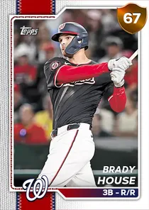 This is the Live card for Brady House, featured in MLB The Show 26. He's a 67 Overall Bronze card primarily playing 3B. He can also fill in at SS. Available on the marketplace for around 136 stubs (buy now price). Brady House has a elite Meta Score of 57.79, indicating his overall effectiveness in competitive play. At the plate, Brady House displays below average contact overall, with specific ratings of 56 Contact vs Right and 48 Contact vs Left. He brings below average power to the plate, evident from his 45 Power vs Right and 42 Power vs Left. In terms of plate discipline, his below average Vision stands at 46, paired with his below average Discipline rating of 33. In the field, Brady House is a good defender. His key defensive attributes are 75 Fielding, 79 Arm Strength, and 69 Reaction time. On the basepaths, Brady House showcases average speed and below average stealing ability. This is supported by 62 Speed, a 15 Stealing rating, and 16 Baserunning Aggression. Brady House is a 22-year-old baseball player, stands 6'4" and weighs 208 lbs, born in Georgia, currently playing for the Nationals, bats R and throws R. Other available versions for Brady House include: Topps Now (92 Diamond), Live (70 Bronze).