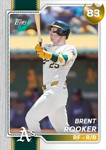 This is the Live card for Brent Rooker, featured in MLB The Show 26. He's a 83 Overall Gold card primarily playing RF. He can also fill in at LF. Available on the marketplace for around 1,295 stubs (sell now price). Brent Rooker has a elite Meta Score of 74.08, indicating his overall effectiveness in competitive play. At the plate, Brent Rooker displays great contact overall, with specific ratings of 76 Contact vs Right and 85 Contact vs Left. He brings great power to the plate, evident from his 83 Power vs Right and 81 Power vs Left. In terms of plate discipline, his below average Vision stands at 54, paired with his average Discipline rating of 68. On the basepaths, Brent Rooker showcases below average speed and below average stealing ability. This is supported by 57 Speed, a 43 Stealing rating, and 48 Baserunning Aggression. Brent Rooker is a 31-year-old baseball player, stands 6'3" and weighs 225 lbs, born in Tennessee, currently playing for the Athletics, bats R and throws R. Active Quirks for Brent Rooker: Homebody, Day Player. Other available versions for Brent Rooker include: 2025 Finest (99 Diamond), 2025 Home Run Derby (97 Diamond), Color Storm (91 Diamond), Live (78 Silver).