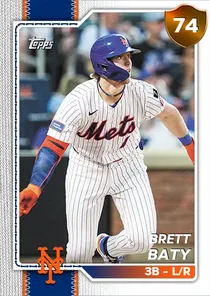 This is the Live card for Brett Baty, featured in MLB The Show 26. He's a 74 Overall Bronze card primarily playing 3B. He can also fill in at 2B. Available on the marketplace for around 40 stubs (sell now price). Brett Baty has a elite Meta Score of 65.49, indicating his overall effectiveness in competitive play. At the plate, Brett Baty displays below average contact overall, with specific ratings of 61 Contact vs Right and 54 Contact vs Left. He brings average power to the plate, evident from his 65 Power vs Right and 61 Power vs Left. In terms of plate discipline, his below average Vision stands at 57, paired with his average Discipline rating of 60. In the field, Brett Baty is a good defender. His key defensive attributes are 72 Fielding, 53 Arm Strength, and 68 Reaction time. On the basepaths, Brett Baty showcases below average speed and below average stealing ability. This is supported by 50 Speed, a 24 Stealing rating, and 16 Baserunning Aggression. Brett Baty is a 26-year-old baseball player, stands 6'3" and weighs 210 lbs, born in Texas, currently playing for the Mets, bats L and throws R. Active Quirks for Brett Baty: Homebody, Night Player. Other available versions for Brett Baty include: Spotlight (99 Diamond), Live (76 Silver).