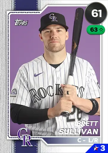 This is the Live card for Brett Sullivan, featured in MLB The Show 26. He's a 61 Overall Common card primarily playing C. He can also fill in at 3B, LF. Available on the marketplace for around 663 stubs (buy now price). Brett Sullivan has a elite Meta Score of 57.33, indicating his overall effectiveness in competitive play. At the plate, Brett Sullivan displays below average contact overall, with specific ratings of 48 Contact vs Right and 58 Contact vs Left. He brings below average power to the plate, evident from his 43 Power vs Right and 40 Power vs Left. In terms of plate discipline, his average Vision stands at 62, paired with his below average Discipline rating of 52. In the field, Brett Sullivan is a below average defender. His key defensive attributes are 50 Fielding, 69 Arm Strength, and 51 Reaction time. On the basepaths, Brett Sullivan showcases below average speed and below average stealing ability. This is supported by 43 Speed, a 0 Stealing rating, and 0 Baserunning Aggression. Brett Sullivan is a 32-year-old baseball player, stands 5'11" and weighs 195 lbs, born in California, currently playing for the Rockies, bats L and throws R. Other available versions for Brett Sullivan include: Live (65 Bronze).