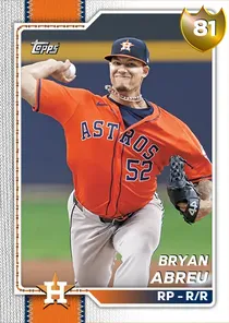 This is the Live card for Bryan Abreu, featured in MLB The Show 26. He's a 81 Overall Gold card primarily playing RP. Available on the marketplace for around 600 stubs (buy now price). Bryan Abreu has a elite Meta Score of 82.30, indicating his overall effectiveness in competitive play. On the mound, Bryan Abreu exhibits great H/9 with a 84 rating, great K/9 with a 86 rating, and below average BB/9 with a 53 rating. With runners threatening, his Pitching Clutch rating of 103 shows elite performance. His overall pitching profile is defined by good control with a Control rating of 72, elite velocity with a Velocity rating of 99, and elite break with a Break rating of 99. He utilizes a 3-pitch mix, spearheaded by a 4-Seam Fastball, complemented by a Slider. Key pitches include: 4-Seam Fastball, Slider, Sinker. Bryan Abreu is a 28-year-old baseball player, stands 6'1" and weighs 230 lbs, born in Dominican Republic, currently playing for the Astros, bats R and throws R. Active Quirks for Bryan Abreu: Homebody, Night Player. Other available versions for Bryan Abreu include: 2025 Finest (99 Diamond), Color Storm (91 Diamond), Live (81 Gold).