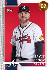 This is the Live card for Bryce Elder, featured in MLB The Show 26. He's a 67 Overall Bronze card primarily playing SP. Available on the marketplace for around 49 stubs (sell now price). Bryce Elder has a elite Meta Score of 63.13, indicating his overall effectiveness in competitive play. On the mound, Bryce Elder exhibits below average H/9 with a 50 rating, below average K/9 with a 50 rating, and average BB/9 with a 66 rating. His overall pitching profile is defined by average control with a Control rating of 61, good velocity with a Velocity rating of 76, and good break with a Break rating of 72. As a starting pitcher, his stamina is great with a rating of 80. He utilizes a 4-pitch mix, spearheaded by a Sinker, complemented by a Slider. Key pitches include: Sinker, Slider, 4-Seam Fastball, Circle Change. Bryce Elder is a 26-year-old baseball player, stands 6'2" and weighs 220 lbs, born in Texas, currently playing for the Braves, bats R and throws R. Active Quirks for Bryce Elder: Break Outlier. Other available versions for Bryce Elder include: Live (71 Bronze).