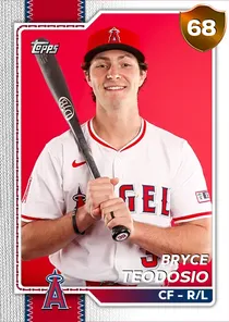 This is the Live card for Bryce Teodosio, featured in MLB The Show 26. He's a 68 Overall Bronze card primarily playing CF. He can also fill in at LF, RF. Available on the marketplace for around 29 stubs (buy now price). Bryce Teodosio has a elite Meta Score of 67.66, indicating his overall effectiveness in competitive play. At the plate, Bryce Teodosio displays below average contact overall, with specific ratings of 37 Contact vs Right and 58 Contact vs Left. He brings below average power to the plate, evident from his 33 Power vs Right and 55 Power vs Left. In terms of plate discipline, his below average Vision stands at 42, paired with his below average Discipline rating of 28. In the field, Bryce Teodosio is a elite defender. His key defensive attributes are 95 Fielding, 79 Arm Strength, and 86 Reaction time. On the basepaths, Bryce Teodosio showcases elite speed and average stealing ability. This is supported by 98 Speed, a 67 Stealing rating, and 68 Baserunning Aggression. Bryce Teodosio is a 26-year-old baseball player, stands 6'3" and weighs 220 lbs, born in South Carolina, currently playing for the Angels, bats R and throws L. Other available versions for Bryce Teodosio include: Live (70 Bronze).