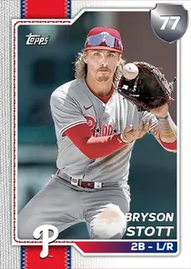This is the Live card for Bryson Stott, featured in MLB The Show 26. He's a 77 Overall Silver card primarily playing 2B. He can also fill in at SS. Available on the marketplace for around 108 stubs (buy now price). Bryson Stott has a elite Meta Score of 73.69, indicating his overall effectiveness in competitive play. At the plate, Bryson Stott displays average contact overall, with specific ratings of 73 Contact vs Right and 64 Contact vs Left. He brings below average power to the plate, evident from his 53 Power vs Right and 34 Power vs Left. In terms of plate discipline, his good Vision stands at 79, paired with his average Discipline rating of 68. In the field, Bryson Stott is a great defender. His key defensive attributes are 86 Fielding, 52 Arm Strength, and 73 Reaction time. On the basepaths, Bryson Stott showcases good speed and great stealing ability. This is supported by 79 Speed, a 80 Stealing rating, and 75 Baserunning Aggression. Bryson Stott is a 28-year-old baseball player, stands 6'1" and weighs 200 lbs, born in Nevada, currently playing for the Phillies, bats L and throws R. Active Quirks for Bryson Stott: Bad Ball Hitter, Situational Hitter, Pinch Hitter. Other available versions for Bryson Stott include: Breakout (87 Diamond), Live (83 Gold).