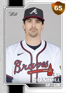 This is the Live card for Cal Quantrill, featured in MLB The Show 26. He's a 65 Overall Bronze card primarily playing SP. Available on the marketplace for around 29 stubs (sell now price). Cal Quantrill has a elite Meta Score of 60.67, indicating his overall effectiveness in competitive play. On the mound, Cal Quantrill exhibits below average H/9 with a 46 rating, below average K/9 with a 44 rating, and average BB/9 with a 64 rating. His overall pitching profile is defined by average control with a Control rating of 62, elite velocity with a Velocity rating of 90, and average break with a Break rating of 64. He utilizes a 5-pitch mix, spearheaded by a Sinker, complemented by a Cutter. Key pitches include: Sinker, Cutter, Splitter, 4-Seam Fastball, 12-6 Curve. Cal Quantrill is a 31-year-old baseball player, stands 6'3" and weighs 195 lbs, born in Canada, currently playing for the Free Agents, bats L and throws R. Other available versions for Cal Quantrill include: Live (68 Bronze).