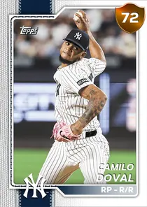This is the Live card for Camilo Doval, featured in MLB The Show 26. He's a 72 Overall Bronze card primarily playing RP. Available on the marketplace for around 71 stubs (sell now price). Camilo Doval has a elite Meta Score of 72.10, indicating his overall effectiveness in competitive play. On the mound, Camilo Doval exhibits good H/9 with a 76 rating, good K/9 with a 76 rating, and below average BB/9 with a 37 rating. His overall pitching profile is defined by good control with a Control rating of 70, elite velocity with a Velocity rating of 99, and elite break with a Break rating of 94. He utilizes a 3-pitch mix, spearheaded by a Slider, complemented by a Cutter. Key pitches include: Slider, Cutter, Sinker. Camilo Doval is a 28-year-old baseball player, stands 6'2" and weighs 205 lbs, born in Dominican Republic, currently playing for the Yankees, bats R and throws R. Active Quirks for Camilo Doval: Homebody, Outlier II. Other available versions for Camilo Doval include: New Threads (98 Diamond), Summer (90 Diamond), World Baseball Classic (82 Gold), Live (77 Silver).