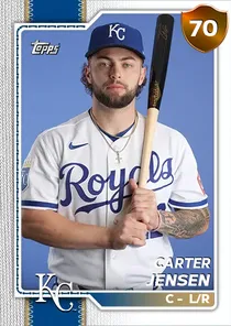 This is the Live card for Carter Jensen, featured in MLB The Show 26. He's a 70 Overall Bronze card primarily playing C. Available on the marketplace for around 27 stubs (buy now price). Carter Jensen has a elite Meta Score of 62.60, indicating his overall effectiveness in competitive play. At the plate, Carter Jensen displays below average contact overall, with specific ratings of 62 Contact vs Right and 48 Contact vs Left. He brings below average power to the plate, evident from his 52 Power vs Right and 42 Power vs Left. In terms of plate discipline, his below average Vision stands at 58, paired with his average Discipline rating of 60. In the field, Carter Jensen is a average defender. His key defensive attributes are 64 Fielding, 81 Arm Strength, and 0 Reaction time. On the basepaths, Carter Jensen showcases below average speed and below average stealing ability. This is supported by 58 Speed, a 20 Stealing rating, and 22 Baserunning Aggression. Carter Jensen is a 22-year-old baseball player, stands 6'0" and weighs 210 lbs, born in Missouri, currently playing for the Royals, bats L and throws R. Other available versions for Carter Jensen include: Spotlight (99 Diamond), Topps Now (83 Gold), Live (68 Bronze).