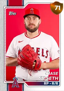 This is the Live card for Chase Silseth, featured in MLB The Show 26. He's a 71 Overall Bronze card primarily playing RP. Available on the marketplace for around 27 stubs (buy now price). Chase Silseth has a elite Meta Score of 70.64, indicating his overall effectiveness in competitive play. On the mound, Chase Silseth exhibits average H/9 with a 63 rating, good K/9 with a 77 rating, and below average BB/9 with a 43 rating. With runners threatening, his Pitching Clutch rating of 84 shows great performance. His overall pitching profile is defined by average control with a Control rating of 66, elite velocity with a Velocity rating of 98, and elite break with a Break rating of 99. He utilizes a 4-pitch mix, spearheaded by a 4-Seam Fastball, complemented by a Sweeper. Key pitches include: 4-Seam Fastball, Sweeper, Splitter, Sinker. Chase Silseth is a 25-year-old baseball player, stands 6'0" and weighs 217 lbs, born in New Mexico, currently playing for the Angels, bats R and throws R. Other available versions for Chase Silseth include: Live (68 Bronze).