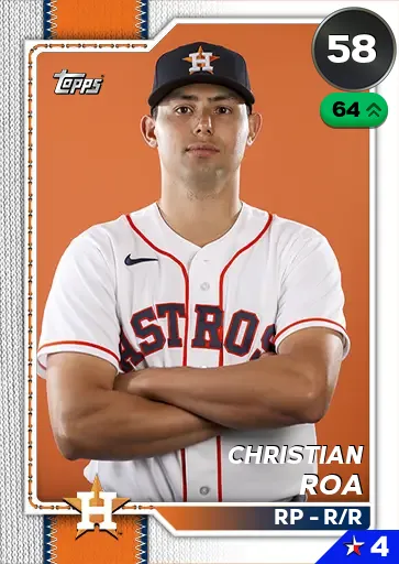 This is the Live card for Christian Roa, featured in MLB The Show 26. He's a 58 Overall Common card primarily playing RP. Available on the marketplace for around 13 stubs (buy now price). Christian Roa has a elite Meta Score of 60.00, indicating his overall effectiveness in competitive play. On the mound, Christian Roa exhibits below average H/9 with a 48 rating, average K/9 with a 63 rating, and below average BB/9 with a 45 rating. His overall pitching profile is defined by below average control with a Control rating of 50, great velocity with a Velocity rating of 80, and below average break with a Break rating of 59. He utilizes a 4-pitch mix, spearheaded by a Sinker, complemented by a Slider. Key pitches include: Sinker, Slider, 4-Seam Fastball, Circle Change. Christian Roa is a 26-year-old baseball player, stands 6'4" and weighs 220 lbs, born in Texas, currently playing for the Astros, bats R and throws R. Other available versions for Christian Roa include: Live (64 Common).