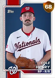 This is the Live card for Cole Henry, featured in MLB The Show 26. He's a 68 Overall Bronze card primarily playing RP. Available on the marketplace for around 220 stubs (buy now price). Cole Henry has a elite Meta Score of 67.63, indicating his overall effectiveness in competitive play. On the mound, Cole Henry exhibits good H/9 with a 76 rating, average K/9 with a 63 rating, and below average BB/9 with a 33 rating. His overall pitching profile is defined by below average control with a Control rating of 51, elite velocity with a Velocity rating of 96, and elite break with a Break rating of 94. He utilizes a 5-pitch mix, spearheaded by a 4-Seam Fastball, complemented by a Slurve. Key pitches include: 4-Seam Fastball, Slurve, Sinker, Cutter, Circle Change. Cole Henry is a 26-year-old baseball player, stands 6'4" and weighs 200 lbs, born in Alabama, currently playing for the Nationals, bats R and throws R. Other available versions for Cole Henry include: Live (66 Bronze).