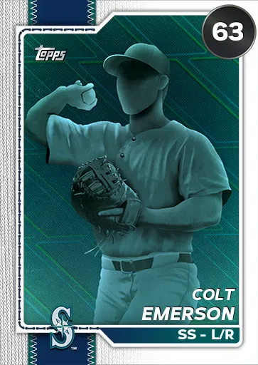 This is the Live card for Colt Emerson, featured in MLB The Show 26. He's a 63 Overall Common card primarily playing SS. He can also fill in at 2B.