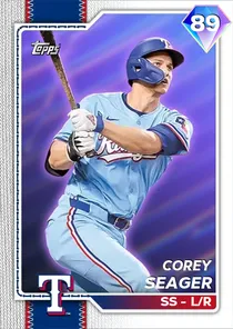 This is the Live card for Corey Seager, featured in MLB The Show 26. He's a 89 Overall Diamond card primarily playing SS. Available on the marketplace for around 58,000 stubs (buy now price). Corey Seager has a elite Meta Score of 82.54, indicating his overall effectiveness in competitive play. At the plate, Corey Seager displays great contact overall, with specific ratings of 95 Contact vs Right and 74 Contact vs Left. He brings great power to the plate, evident from his 95 Power vs Right and 76 Power vs Left. In terms of plate discipline, his good Vision stands at 75, paired with his great Discipline rating of 80. In the field, Corey Seager is a great defender. His key defensive attributes are 80 Fielding, 50 Arm Strength, and 72 Reaction time. Corey Seager is a 31-year-old baseball player, stands 6'3" and weighs 215 lbs, born in North Carolina, currently playing for the Rangers, bats L and throws R. Active Quirks for Corey Seager: Homebody, Breaking Ball Hitter, Rally Monkey, Night Player, Table Setter. Other available versions for Corey Seager include: Awards (99 Diamond), Pipeline Past (93 Diamond), Live (82 Gold).