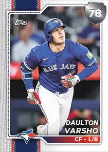 This is the Live card for Daulton Varsho, featured in MLB The Show 26. He's a 78 Overall Silver card primarily playing CF. He can also fill in at LF. Available on the marketplace for around 132 stubs (buy now price). Daulton Varsho has a elite Meta Score of 70.11, indicating his overall effectiveness in competitive play. At the plate, Daulton Varsho displays average contact overall, with specific ratings of 44 Contact vs Right and 79 Contact vs Left. He brings good power to the plate, evident from his 82 Power vs Right and 59 Power vs Left. In terms of plate discipline, his below average Vision stands at 50, paired with his average Discipline rating of 61. In the field, Daulton Varsho is a elite defender. His key defensive attributes are 99 Fielding, 30 Arm Strength, and 85 Reaction time. On the basepaths, Daulton Varsho showcases good speed and below average stealing ability. This is supported by 73 Speed, a 36 Stealing rating, and 40 Baserunning Aggression. Daulton Varsho is a 29-year-old baseball player, stands 5'8" and weighs 207 lbs, born in Wisconsin, currently playing for the Blue Jays, bats L and throws R. Other available versions for Daulton Varsho include: Spotlight (99 Diamond), Moonshot (89 Diamond), Live (84 Gold).