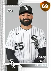 This is the Live card for Derek Hill, featured in MLB The Show 26. He's a 69 Overall Bronze card primarily playing CF. He can also fill in at LF. Available on the marketplace for around 215 stubs (buy now price). Derek Hill has a elite Meta Score of 66.92, indicating his overall effectiveness in competitive play. At the plate, Derek Hill displays below average contact overall, with specific ratings of 43 Contact vs Right and 59 Contact vs Left. He brings below average power to the plate, evident from his 43 Power vs Right and 60 Power vs Left. In terms of plate discipline, his below average Vision stands at 37, paired with his below average Discipline rating of 36. In the field, Derek Hill is a great defender. His key defensive attributes are 81 Fielding, 71 Arm Strength, and 74 Reaction time. On the basepaths, Derek Hill showcases elite speed and below average stealing ability. This is supported by 99 Speed, a 41 Stealing rating, and 59 Baserunning Aggression. Derek Hill is a 30-year-old baseball player, stands 6'1" and weighs 206 lbs, born in California, currently playing for the White Sox, bats R and throws R. Other available versions for Derek Hill include: Live (73 Bronze).