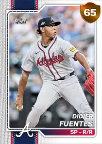 This is the Live card for Didier Fuentes, featured in MLB The Show 26. He's a 65 Overall Bronze card primarily playing SP. Available on the marketplace for around 38 stubs (sell now price). Didier Fuentes has a elite Meta Score of 57.07, indicating his overall effectiveness in competitive play. On the mound, Didier Fuentes exhibits below average H/9 with a 57 rating, below average K/9 with a 56 rating, and below average BB/9 with a 38 rating. His overall pitching profile is defined by below average control with a Control rating of 50, great velocity with a Velocity rating of 83, and below average break with a Break rating of 55. He utilizes a 4-pitch mix, spearheaded by a 4-Seam Fastball, complemented by a Sweeper. Key pitches include: 4-Seam Fastball, Sweeper, Curveball, Splitter. Didier Fuentes is a 20-year-old baseball player, stands 6'0" and weighs 170 lbs, born in Colombia, currently playing for the Braves, bats R and throws R. Other available versions for Didier Fuentes include: Live (63 Common).