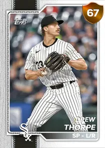 This is the Live card for Drew Thorpe, featured in MLB The Show 26. He's a 67 Overall Bronze card primarily playing SP. Available on the marketplace for around 192 stubs (buy now price). Drew Thorpe has a elite Meta Score of 66.46, indicating his overall effectiveness in competitive play. On the mound, Drew Thorpe exhibits good H/9 with a 78 rating, below average K/9 with a 39 rating, and below average BB/9 with a 47 rating. His overall pitching profile is defined by average control with a Control rating of 64, below average velocity with a Velocity rating of 57, and elite break with a Break rating of 94. He utilizes a 5-pitch mix, spearheaded by a Circle Change, complemented by a 4-Seam Fastball. Key pitches include: Circle Change, 4-Seam Fastball, Slider, Cutter, Sweeper. Drew Thorpe is a 25-year-old baseball player, stands 6'4" and weighs 220 lbs, born in Utah, currently playing for the White Sox, bats L and throws R. Other available versions for Drew Thorpe include: Live (69 Bronze).