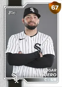 This is the Live card for Edgar Quero, featured in MLB The Show 26. He's a 67 Overall Bronze card primarily playing C. Available on the marketplace for around 175 stubs (buy now price). Edgar Quero has a elite Meta Score of 57.95, indicating his overall effectiveness in competitive play. At the plate, Edgar Quero displays good contact overall, with specific ratings of 51 Contact vs Right and 90 Contact vs Left. He brings below average power to the plate, evident from his 43 Power vs Right and 34 Power vs Left. In terms of plate discipline, his good Vision stands at 72, paired with his below average Discipline rating of 59. Edgar Quero is a 22-year-old baseball player, stands 5'10" and weighs 205 lbs, born in Cuba, currently playing for the White Sox, bats S and throws R. Other available versions for Edgar Quero include: Live (76 Silver).