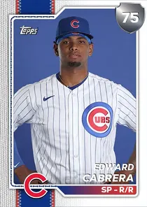This is the Live card for Edward Cabrera, featured in MLB The Show 26. He's a 75 Overall Silver card primarily playing SP. Available on the marketplace for around 64 stubs (buy now price). Edward Cabrera has a elite Meta Score of 71.34, indicating his overall effectiveness in competitive play. On the mound, Edward Cabrera exhibits average H/9 with a 67 rating, average K/9 with a 66 rating, and below average BB/9 with a 45 rating. His overall pitching profile is defined by average control with a Control rating of 62, elite velocity with a Velocity rating of 99, and great break with a Break rating of 87. He utilizes a 5-pitch mix, spearheaded by a Circle Change, complemented by a 12-6 Curve. Key pitches include: Circle Change, 12-6 Curve, Sinker, Slider, 4-Seam Fastball. Edward Cabrera is a 27-year-old baseball player, stands 6'5" and weighs 217 lbs, born in Dominican Republic, currently playing for the Cubs, bats R and throws R. Active Quirks for Edward Cabrera: Day Player. Other available versions for Edward Cabrera include: Spotlight (99 Diamond), Egg Hunt (87 Diamond), Live (79 Silver).