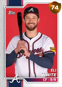 This is the Live card for Eli White, featured in MLB The Show 26. He's a 74 Overall Bronze card primarily playing CF. He can also fill in at LF, RF. Available on the marketplace for around 25 stubs (buy now price). Eli White has a elite Meta Score of 70.93, indicating his overall effectiveness in competitive play. At the plate, Eli White displays below average contact overall, with specific ratings of 49 Contact vs Right and 59 Contact vs Left. He brings below average power to the plate, evident from his 48 Power vs Right and 60 Power vs Left. In terms of plate discipline, his below average Vision stands at 50, paired with his below average Discipline rating of 33. In the field, Eli White is a good defender. His key defensive attributes are 78 Fielding, 80 Arm Strength, and 72 Reaction time. On the basepaths, Eli White showcases elite speed and good stealing ability. This is supported by 98 Speed, a 70 Stealing rating, and 70 Baserunning Aggression. Eli White is a 31-year-old baseball player, stands 6'3" and weighs 195 lbs, born in South Carolina, currently playing for the Braves, bats R and throws R. Active Quirks for Eli White: Pinch Hitter. Other available versions for Eli White include: Topps Now (97 Diamond), Live (77 Silver).
