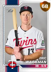 This is the Live card for Eric Wagaman, featured in MLB The Show 26. He's a 68 Overall Bronze card primarily playing 3B. He can also fill in at 1B, LF, RF. Available on the marketplace for around 27 stubs (buy now price). Eric Wagaman has a elite Meta Score of 57.81, indicating his overall effectiveness in competitive play. At the plate, Eric Wagaman displays average contact overall, with specific ratings of 58 Contact vs Right and 73 Contact vs Left. He brings below average power to the plate, evident from his 40 Power vs Right and 50 Power vs Left. In terms of plate discipline, his good Vision stands at 70, paired with his below average Discipline rating of 45. In the field, Eric Wagaman is a below average defender. His key defensive attributes are 52 Fielding, 40 Arm Strength, and 62 Reaction time. On the basepaths, Eric Wagaman showcases below average speed and below average stealing ability. This is supported by 48 Speed, a 12 Stealing rating, and 10 Baserunning Aggression. Eric Wagaman is a 28-year-old baseball player, stands 6'4" and weighs 210 lbs, born in California, currently playing for the Twins, bats R and throws R. Active Quirks for Eric Wagaman: Pinch Hitter. Other available versions for Eric Wagaman include: Live (68 Bronze).