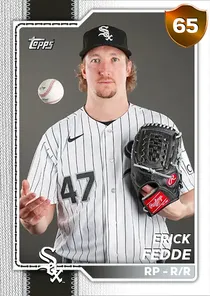 This is the Live card for Erick Fedde, featured in MLB The Show 26. He's a 65 Overall Bronze card primarily playing RP. Available on the marketplace for around 183 stubs (buy now price). Erick Fedde has a elite Meta Score of 65.22, indicating his overall effectiveness in competitive play. On the mound, Erick Fedde exhibits average H/9 with a 62 rating, below average K/9 with a 41 rating, and good BB/9 with a 77 rating. His overall pitching profile is defined by good control with a Control rating of 75, great velocity with a Velocity rating of 87, and good break with a Break rating of 77. He utilizes a 4-pitch mix, spearheaded by a Sinker, complemented by a Cutter. Key pitches include: Sinker, Cutter, Sweeper, Circle Change. Erick Fedde is a 33-year-old baseball player, stands 6'4" and weighs 205 lbs, born in Nevada, currently playing for the White Sox, bats R and throws R. Active Quirks for Erick Fedde: Break Outlier. Other available versions for Erick Fedde include: Topps Now (88 Diamond), Live (63 Common).