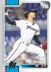 This is the Live card for Eury Perez, featured in MLB The Show 26. He's a 78 Overall Silver card primarily playing SP. Available on the marketplace for around 162 stubs (buy now price). Eury Perez has a elite Meta Score of 74.54, indicating his overall effectiveness in competitive play. On the mound, Eury Perez exhibits good H/9 with a 78 rating, average K/9 with a 66 rating, and below average BB/9 with a 59 rating. His overall pitching profile is defined by good control with a Control rating of 72, elite velocity with a Velocity rating of 93, and great break with a Break rating of 85. He utilizes a 5-pitch mix, spearheaded by a 4-Seam Fastball, complemented by a Slider. Key pitches include: 4-Seam Fastball, Slider, 12-6 Curve, Circle Change, Sweeper. Eury Perez is a 22-year-old baseball player, stands 6'8" and weighs 220 lbs, born in Dominican Republic, currently playing for the Marlins, bats R and throws R. Active Quirks for Eury Perez: Homebody, Day Player. Other available versions for Eury Perez include: Neon (99 Diamond), Live (81 Gold).