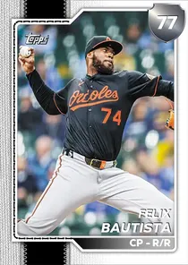 This is the Live card for Felix Bautista, featured in MLB The Show 26. He's a 77 Overall Silver card primarily playing CP. Available on the marketplace for around 112 stubs (buy now price). Felix Bautista has a elite Meta Score of 73.32, indicating his overall effectiveness in competitive play. On the mound, Felix Bautista exhibits elite H/9 with a 92 rating, great K/9 with a 84 rating, and below average BB/9 with a 25 rating. With runners threatening, his Pitching Clutch rating of 90 shows elite performance. His overall pitching profile is defined by great control with a Control rating of 82, elite velocity with a Velocity rating of 99, and great break with a Break rating of 81. He utilizes a 3-pitch mix, spearheaded by a Sinker, complemented by a Splitter. Key pitches include: Sinker, Splitter, Slider. Felix Bautista is a 30-year-old baseball player, stands 6'8" and weighs 285 lbs, born in Dominican Republic, currently playing for the Free Agents, bats R and throws R. Active Quirks for Felix Bautista: Outlier I. Other available versions for Felix Bautista include: Awards (99 Diamond), All-Star (94 Diamond), Live (78 Silver), Moonshot (64 Common).