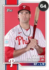 This is the Live card for Gabriel Rincones Jr., featured in MLB The Show 26. He's a 64 Overall Common card primarily playing RF. He can also fill in at LF, CF. Available on the marketplace for around 10 stubs (sell now price). Gabriel Rincones Jr. has a elite Meta Score of 55.27, indicating his overall effectiveness in competitive play. At the plate, Gabriel Rincones Jr. displays below average contact overall, with specific ratings of 54 Contact vs Right and 42 Contact vs Left. He brings below average power to the plate, evident from his 58 Power vs Right and 46 Power vs Left. In terms of plate discipline, his below average Vision stands at 42, paired with his below average Discipline rating of 38. In the field, Gabriel Rincones Jr. is a average defender. His key defensive attributes are 65 Fielding, 66 Arm Strength, and 65 Reaction time. On the basepaths, Gabriel Rincones Jr. showcases average speed and below average stealing ability. This is supported by 61 Speed, a 27 Stealing rating, and 24 Baserunning Aggression. Gabriel Rincones Jr. is a 25-year-old baseball player, stands 6'3" and weighs 225 lbs, born in Florida, currently playing for the Phillies, bats L and throws R. Other available versions for Gabriel Rincones Jr. include: Live (66 Bronze).