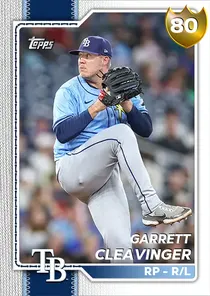 This is the Live card for Garrett Cleavinger, featured in MLB The Show 26. He's a 80 Overall Gold card primarily playing RP. Available on the marketplace for around 420 stubs (buy now price). Garrett Cleavinger has a elite Meta Score of 81.35, indicating his overall effectiveness in competitive play. On the mound, Garrett Cleavinger exhibits great H/9 with a 84 rating, great K/9 with a 81 rating, and below average BB/9 with a 59 rating. With runners threatening, his Pitching Clutch rating of 86 shows great performance. His overall pitching profile is defined by good control with a Control rating of 73, elite velocity with a Velocity rating of 99, and elite break with a Break rating of 96. He utilizes a 5-pitch mix, spearheaded by a Slider, complemented by a Sinker. Key pitches include: Slider, Sinker, 4-Seam Fastball, Sweeper, Cutter. Garrett Cleavinger is a 31-year-old baseball player, stands 6'1" and weighs 220 lbs, born in Kansas, currently playing for the Rays, bats R and throws L. Active Quirks for Garrett Cleavinger: Homebody, Pick Off Artist, Stopper, Night Player. Other available versions for Garrett Cleavinger include: Live (83 Gold).