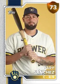 This is the Live card for Gary Sánchez, featured in MLB The Show 26. He's a 73 Overall Bronze card primarily playing C. Available on the marketplace for around 63 stubs (buy now price). Gary Sánchez has a elite Meta Score of 60.45, indicating his overall effectiveness in competitive play. At the plate, Gary Sánchez displays below average contact overall, with specific ratings of 48 Contact vs Right and 46 Contact vs Left. He brings good power to the plate, evident from his 65 Power vs Right and 80 Power vs Left. In terms of plate discipline, his below average Vision stands at 49, paired with his average Discipline rating of 60. In the field, Gary Sánchez is a below average defender. His key defensive attributes are 51 Fielding, 93 Arm Strength, and 0 Reaction time. Gary Sánchez is a 33-year-old baseball player, stands 6'2" and weighs 245 lbs, born in Dominican Republic, currently playing for the Brewers, bats R and throws R. Other available versions for Gary Sánchez include: New Threads (86 Diamond), Live (76 Silver).