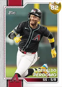 This is the Live card for Geraldo Perdomo, featured in MLB The Show 26. He's a 82 Overall Gold card primarily playing SS. Available on the marketplace for around 905 stubs (buy now price). Geraldo Perdomo has a elite Meta Score of 79.30, indicating his overall effectiveness in competitive play. At the plate, Geraldo Perdomo displays great contact overall, with specific ratings of 71 Contact vs Right and 106 Contact vs Left. He brings below average power to the plate, evident from his 51 Power vs Right and 45 Power vs Left. In terms of plate discipline, his great Vision stands at 86, paired with his great Discipline rating of 82. In the field, Geraldo Perdomo is a good defender. His key defensive attributes are 72 Fielding, 73 Arm Strength, and 67 Reaction time. On the basepaths, Geraldo Perdomo showcases below average speed and average stealing ability. This is supported by 53 Speed, a 61 Stealing rating, 0 Baserunning Ability, and 64 Baserunning Aggression. Geraldo Perdomo is a 26-year-old baseball player, stands 6'2" and weighs 203 lbs, born in Dominican Republic, currently playing for the Diamondbacks, bats S and throws R. Active Quirks for Geraldo Perdomo: Homebody, Dead Red, Breaking Ball Hitter, Unfazed, Rally Monkey, Bad Ball Hitter, Situational Hitter, Night Player, Table Setter. Other available versions for Geraldo Perdomo include: Neon (99 Diamond), Summer (91 Diamond), World Baseball Classic (90 Diamond), Live (86 Diamond).