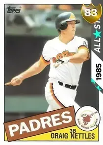 This is the All-Star card for Graig Nettles, featured in MLB The Show 26. He's a 83 Overall Gold card primarily playing 3B. Graig Nettles has a elite Meta Score of 78.62, indicating his overall effectiveness in competitive play. At the plate, Graig Nettles displays good contact overall, with specific ratings of 85 Contact vs Right and 67 Contact vs Left. He brings good power to the plate, evident from his 65 Power vs Right and 74 Power vs Left. In terms of plate discipline, his elite Vision stands at 90, paired with his elite Discipline rating of 96. In the field, Graig Nettles is a average defender. His key defensive attributes are 64 Fielding, 70 Arm Strength, and 60 Reaction time. On the basepaths, Graig Nettles showcases below average speed and below average stealing ability. This is supported by 40 Speed, a 0 Stealing rating, and 0 Baserunning Aggression. Graig Nettles is a 40-year-old baseball player, stands 6'0" and weighs 187 lbs, born in California, currently playing for the Padres, bats L and throws R. Active Quirks for Graig Nettles: Homebody, Dead Red, Breaking Ball Hitter, Day Player. Other available versions for Graig Nettles include: Standout (93 Diamond).
