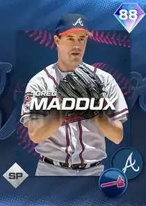 This is the Jolt card for Greg Maddux, featured in MLB The Show 26. He's a 88 Overall Diamond card primarily playing SP. Greg Maddux has a elite Meta Score of 87.14, indicating his overall effectiveness in competitive play. On the mound, Greg Maddux exhibits good H/9 with a 72 rating, good K/9 with a 76 rating, and elite BB/9 with a 102 rating. With runners threatening, his Pitching Clutch rating of 82 shows great performance. His overall pitching profile is defined by great control with a Control rating of 84, average velocity with a Velocity rating of 63, and elite break with a Break rating of 99. As a starting pitcher, his stamina is elite with a rating of 97. He utilizes a 5-pitch mix, spearheaded by a Sinker, complemented by a Cutter. Key pitches include: Sinker, Cutter, Circle Change, Curveball, Slider. Greg Maddux is a 35-year-old baseball player, stands 6'0" and weighs 175 lbs, born in Texas, currently playing for the Braves, bats R and throws R. Active Quirks for Greg Maddux: Road Warrior, Pick Off Artist, Night Player, Break Outlier. Other available versions for Greg Maddux include: Spooky (99 Diamond), All-Star (97 Diamond), Breakout (86 Diamond).