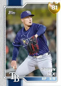 This is the Live card for Griffin Jax, featured in MLB The Show 26. He's a 81 Overall Gold card primarily playing RP. Available on the marketplace for around 601 stubs (buy now price). Griffin Jax has a elite Meta Score of 82.04, indicating his overall effectiveness in competitive play. On the mound, Griffin Jax exhibits good H/9 with a 76 rating, great K/9 with a 84 rating, and good BB/9 with a 75 rating. With runners threatening, his Pitching Clutch rating of 89 shows great performance. His overall pitching profile is defined by good control with a Control rating of 78, elite velocity with a Velocity rating of 99, and great break with a Break rating of 81. He utilizes a 5-pitch mix, spearheaded by a Sweeper, complemented by a Circle Change. Key pitches include: Sweeper, Circle Change, 4-Seam Fastball, Sinker, Cutter. Griffin Jax is a 31-year-old baseball player, stands 6'2" and weighs 195 lbs, born in Colorado, currently playing for the Rays, bats R and throws R. Active Quirks for Griffin Jax: Homebody. Other available versions for Griffin Jax include: New Threads (97 Diamond), Summer (92 Diamond), Live (82 Gold).