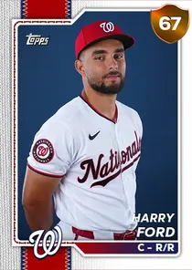 This is the Live card for Harry Ford, featured in MLB The Show 26. He's a 67 Overall Bronze card primarily playing C. Available on the marketplace for around 216 stubs (buy now price). Harry Ford has a elite Meta Score of 61.14, indicating his overall effectiveness in competitive play. At the plate, Harry Ford displays below average contact overall, with specific ratings of 48 Contact vs Right and 53 Contact vs Left. He brings below average power to the plate, evident from his 47 Power vs Right and 55 Power vs Left. In terms of plate discipline, his below average Vision stands at 38, paired with his below average Discipline rating of 50. In the field, Harry Ford is a average defender. His key defensive attributes are 64 Fielding, 69 Arm Strength, and 66 Reaction time. On the basepaths, Harry Ford showcases great speed and below average stealing ability. This is supported by 81 Speed, a 34 Stealing rating, and 32 Baserunning Aggression. Harry Ford is a 23-year-old baseball player, stands 5'10" and weighs 200 lbs, born in Georgia, currently playing for the Nationals, bats R and throws R. Other available versions for Harry Ford include: Topps Now (97 Diamond), Live (69 Bronze).