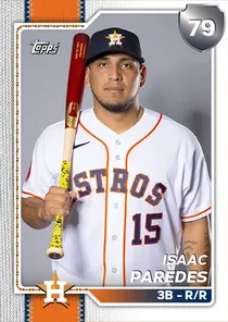 This is the Live card for Isaac Paredes, featured in MLB The Show 26. He's a 79 Overall Silver card primarily playing 3B. He can also fill in at 1B. Available on the marketplace for around 176 stubs (buy now price). Isaac Paredes has a elite Meta Score of 72.80, indicating his overall effectiveness in competitive play. At the plate, Isaac Paredes displays good contact overall, with specific ratings of 67 Contact vs Right and 75 Contact vs Left. He brings good power to the plate, evident from his 76 Power vs Right and 70 Power vs Left. In terms of plate discipline, his good Vision stands at 79, paired with his great Discipline rating of 82. In the field, Isaac Paredes is a average defender. His key defensive attributes are 61 Fielding, 47 Arm Strength, and 64 Reaction time. Isaac Paredes is a 27-year-old baseball player, stands 5'11" and weighs 213 lbs, born in Mexico, currently playing for the Astros, bats R and throws R. Active Quirks for Isaac Paredes: Homebody, Breaking Ball Hitter, Fighter, Rally Monkey, Night Player, Table Setter. Other available versions for Isaac Paredes include: 2025 All-Star (96 Diamond), Spotlight (92 Diamond), New Threads (84 Gold), Live (80 Gold).