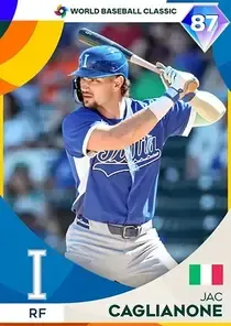 This is the World Baseball Classic card for Jac Caglianone, featured in MLB The Show 26. He's a 87 Overall Diamond card primarily playing RF. He can also fill in at 1B, LF. Jac Caglianone has a elite Meta Score of 80.00, indicating his overall effectiveness in competitive play. At the plate, Jac Caglianone displays good contact overall, with specific ratings of 72 Contact vs Right and 77 Contact vs Left. He brings great power to the plate, evident from his 80 Power vs Right and 90 Power vs Left. In terms of plate discipline, his good Vision stands at 70, paired with his average Discipline rating of 69. In the field, Jac Caglianone is a average defender. His key defensive attributes are 60 Fielding, 99 Arm Strength, and 66 Reaction time. On the basepaths, Jac Caglianone showcases below average speed and below average stealing ability. This is supported by 57 Speed, a 8 Stealing rating, and 10 Baserunning Aggression. Jac Caglianone is a 23-year-old baseball player, stands 6'5" and weighs 250 lbs, born in Florida, currently playing for the Royals, bats L and throws L. Active Quirks for Jac Caglianone: Homebody, First-Pitch Hitter, Dead Red, Day Player. Other available versions for Jac Caglianone include: Neon (99 Diamond), Topps Now (91 Diamond), Pipeline (85 Diamond), Live (73 Bronze), Live (68 Bronze).
